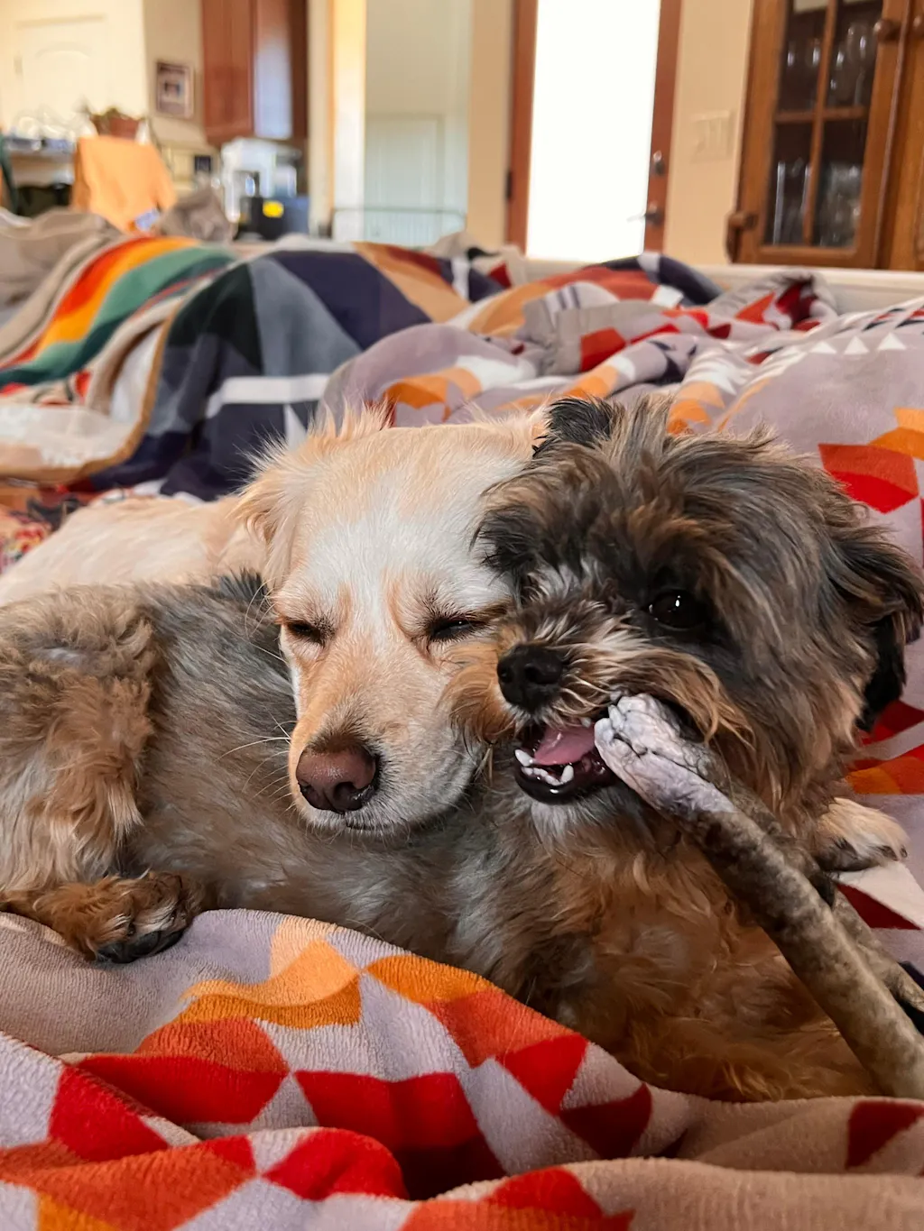 We love these so much! Our dogs will sit with them for such a long time. One being a puppy, a Texas Heeler, and when I need a little break from his crazy, these help.