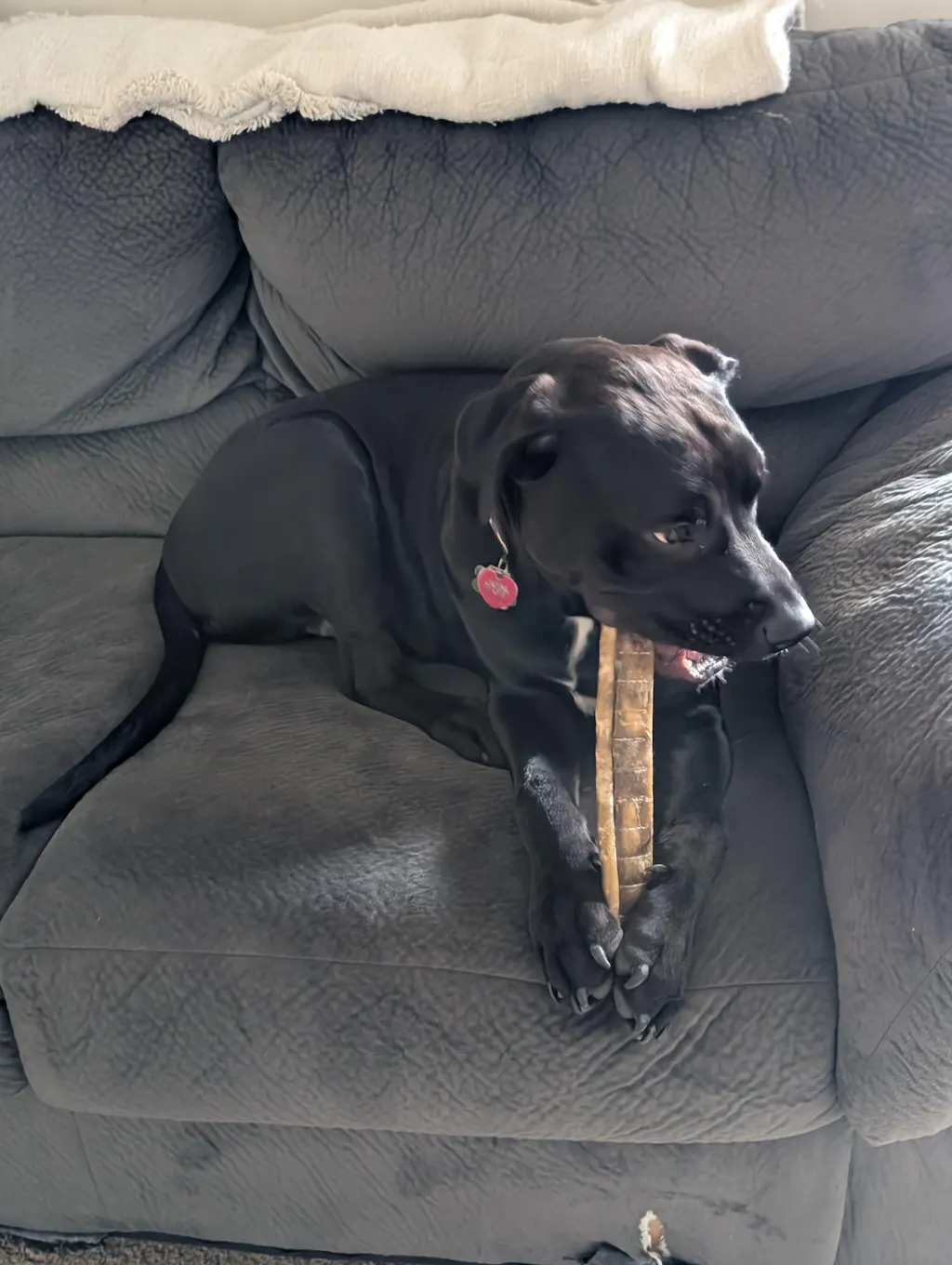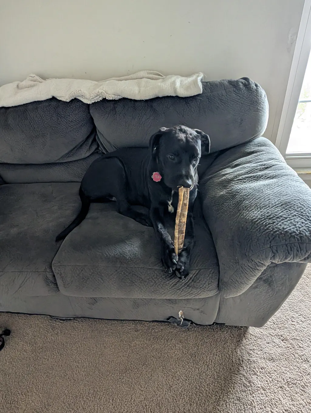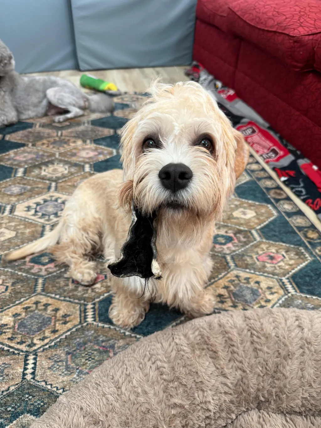 My lil pup has had a bad habit of chewing on the corner of our carpet. This chew has been the perfect substitute, whenever he gets a hankering for some carpet fibers we throw this to him and he happily chews and pulls the strands of fur instead! Totally worth it if your dog loves pulling strands.