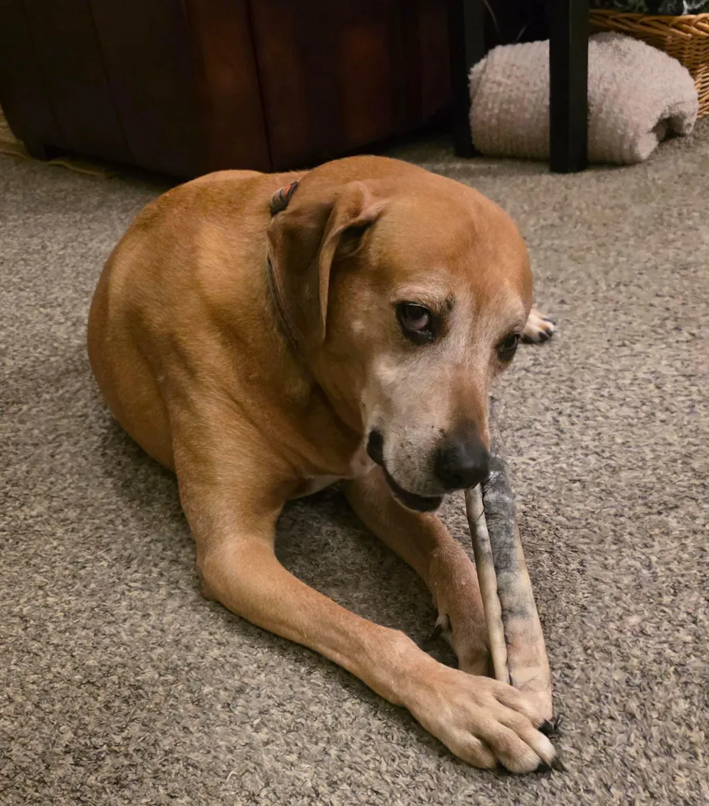 This is the longest lasting chew my hard core chewing greyhound has ever gotten. It took him an entire week to eat one large size. I would have given this a 5 star review aside from a couple small little factors (it wouldn’t let me choose a half star so my final review is actually a 4.5). The couple small factors are the smell after long chewing. Now that I know I’ll put it away before that scent hits. The only other smaller thing is my dogs gut had a hard time with the fur a couple mornings and threw up hair balls. Which I guess is fitting considering greyhounds are like giant cats.